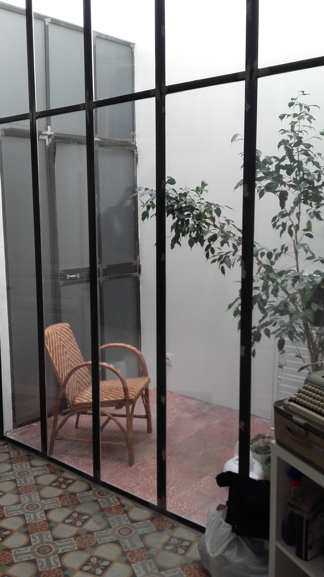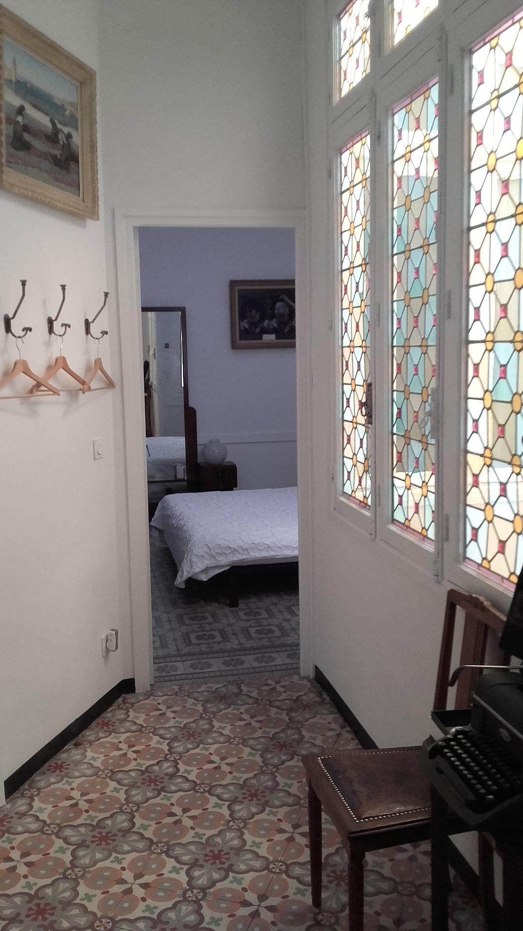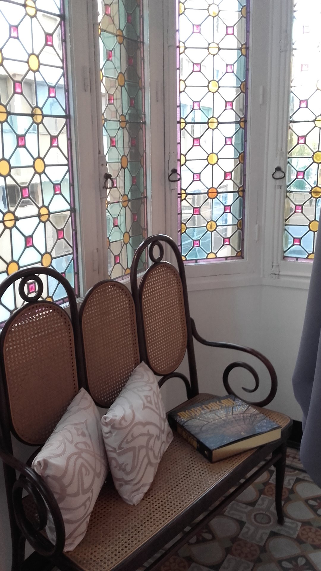 Vous entrez dans l'appartement par un hall éclairé par un jardin d'hiver arboré à la belle verrière d'acier. A gauche le séjour s'orne d'un oriel (bow-window) aux vitraux géométriques. Cuisine, salle à manger, salon sur 29 m² . Un couchage caché dans le cosy art déco convient pour un enfant ou un adulte. A droite de l'entrée, dans la chambre, (17 m² - lit en 180) une armoire penderie, une psyché , une coiffeuse compose une confortable déco vintage années trente .